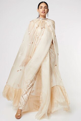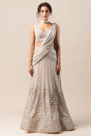 The part-pant-part-sari proves the innovative spirit of the concept sari. Or give your one-and-done jumpsuit a traditional turn with an unconventional drape. While the pre-pleated sari is the most fuss-free version of the six-yard, add a voluminous flare with a lehenga or sharara set iteration for a Sangeet night. You’ll not regret counting on the palazzo-sari style for an action-packed festive day.