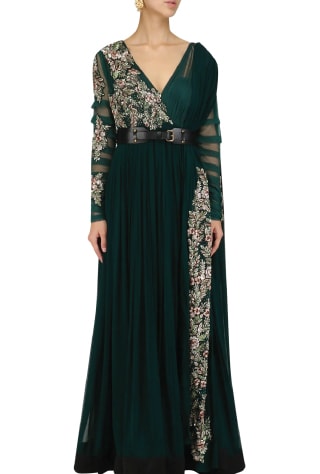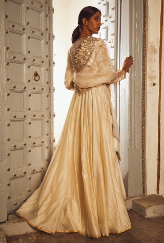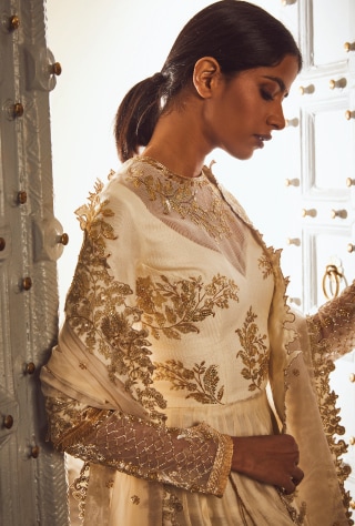 The Anarkali ensemble traces its origin in the Mughal Era, named after an iconic courtesan of their empire. The name literally translates as a flower bud of the pomegranate fruit. While the iconic love saga of Mughal Crown Prince Salim and Anarkali is recognised for popularizing the ensemble, it was commonly adorned by the royal women of the Mughal Era for a demure and elegant appeal.
