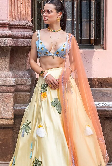 During the damp weather and probable downpours, it is best to opt for lehengas with lightweight embroideries or striking prints. Whether for a daytime mehendi function or nighttime cocktail party, an easy-breezy number will allow you to twirl away in full glory! The bright yellow lehenga set by The Little Black Bow features patchwork embroidery, perfect for evoking the celebratory spirit on a gloomy day. The pastel shades of this ensemble will look ethereal during any event on a monsoon afternoon. Accessorize it with minimal jewellery to avoid extreme sweat, and finish the look with statement sunglasses.