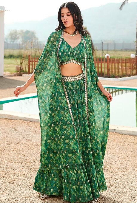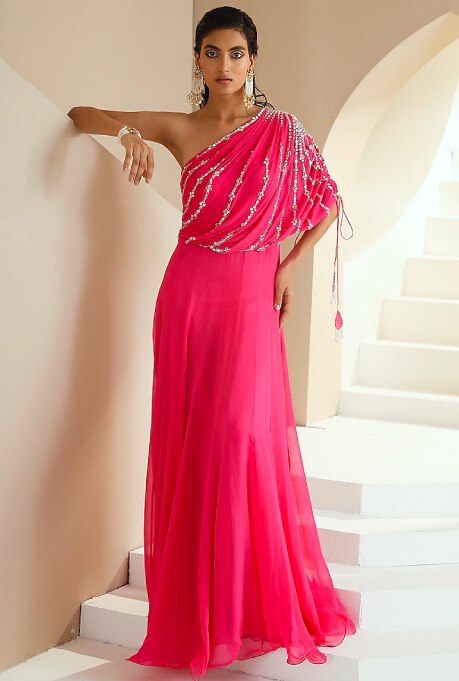 A windy day with downpours might sound idyllic when you are home reading a book, but if you plan to attend a rainy-day wedding, hassle-free silhouettes are undoubtedly the best option! The georgette printed cape set by Basanti – Kapde Aur Koffee is both flowy and effortlessly stylish. While the flared pants will give you ease of movement, the bustier and cape will ensure a dreamy look with a hands-free experience. To amp up the glam quotient, go for the new-age, one-shoulder Anarkali by Seema Thukral. Featuring minimal embroidery and a flattering fit, this ensemble is an excellent addition to your monsoon wedding wardrobe, whether you are the bride or her bridesmaid.