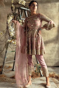 When planning a monsoon wedding wardrobe, shorter hemlines are always a failsafe option, as they will elevate your wedding glam look without being at risk of getting spoilt. The printed lehenga set by Baise Gaba features a vibrant play of colours and prints with the perfect hemline length. Style it with high heels and chunky silver jewellery for a whimsical bohemian look. While this fit has a minimal aesthetic, the rose gold short Anarkali set by Rachit Khanna is great for amping up the glam quotient. Make a carefree statement in this outfit, as the short tunic and tapered pants will eliminate the hazard of getting smeared with mud.