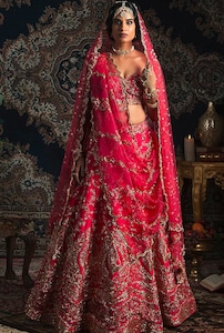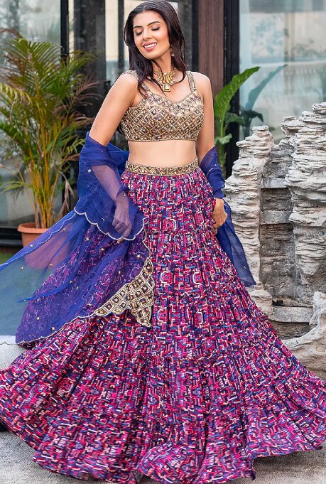 A glamorous and fun-filled sangeet or cocktail party deserves a spotlight-worthy lehenga like the one by Mehak Murpana. The enchanting floral print on the rich-hued base will make you stand out, while the gold embroidered bustier will add gravity to this look.