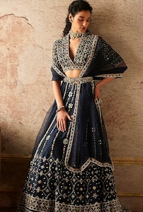 If you are fond of heavy embroideries and regal fabrics, no weather should stop you from donning your dream outfit! However, if you plan on having an outdoor wedding, opting for deep hues will minimize the chances of probable mishaps caused due to mud splashes. The hot pink lehenga by Rachit Khanna is the perfect bridal ensemble for the main wedding day. The dabka work on this lehenga will ensure that the embroidery doesn’t blacken due to moisture, unlike heavy zardosi or gota-patti work. For a glam-filled cocktail party, go for a darker shade like the navy lehenga set by Ridhi Mehra. Featuring regal bead embroidery, this medium-heavy piece is perfect for dancing away the night with maximum glitz and comfort.