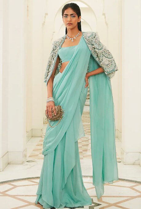 No matter how many modern and innovative creations you might browse through, the timeless charm of a saree is indispensable. However, handling a six-yard drape amidst rain-soaked surroundings can be challenging. When looking for a saree to don at monsoon weddings, a pre-draped saree is an unbeatable choice! For a daytime event, opt for a pastel shade like the teal pre-draped jacket saree set by Ridhima Bhasin. The dreamy hue and dazzling embroidery of this ensemble are best suited for making an ethereal fashion statement under gloomy skies. If you are not up to taking the risk of wearing pastels, the oxblood ruffled saree set by Charu & Vasundhara will put you in the spotlight for a nighttime cocktail or reception party! Style it with Kundan jewellery to complete the look and create a show-stopping fashion statement.
